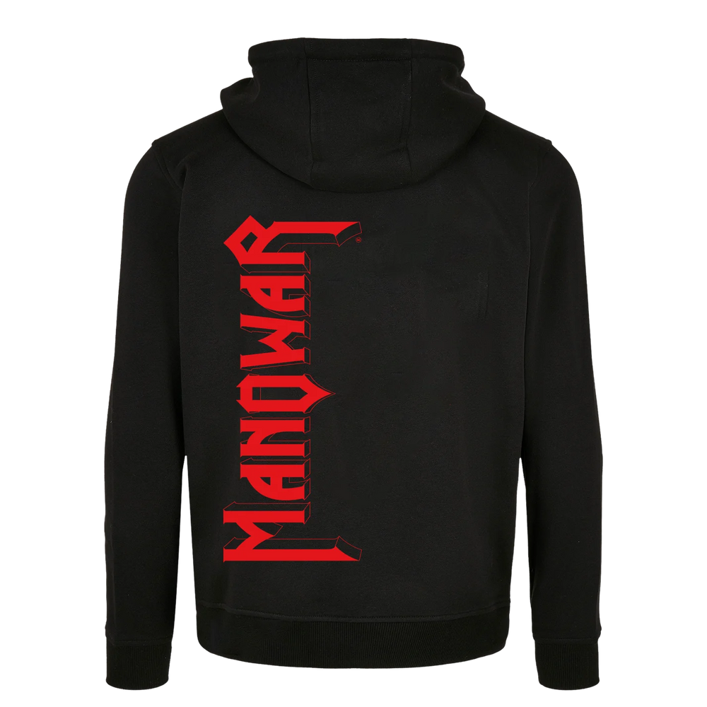 MANOWAR Zip Hoodie for men, showcasing the iconic 3D outline logo in a striking vertical design in red. Crafted with premium materials, this hoodie combines both comfort and style, making it an essential addition to any dedicated fan's collection. Whether you're gearing up for a concert or simply want to showcase your love for the band, this hoodie offers both warmth and a timeless metal aesthetic. Embrace the power of MANOWAR with this bold and stylish Zip Hoodie.